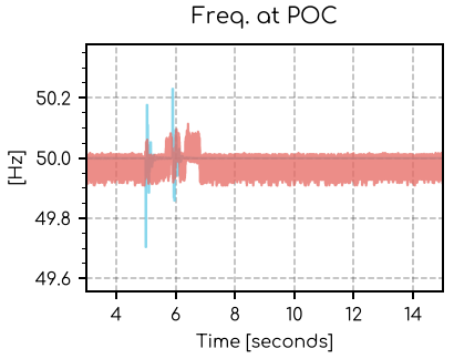 R Source (pu)andX Source (pu)equal to0have unstable frequency responses (see below). - We have also seen PSS®E Dynamic initial conditions with extremely large initial reactive power values which had similar instability.